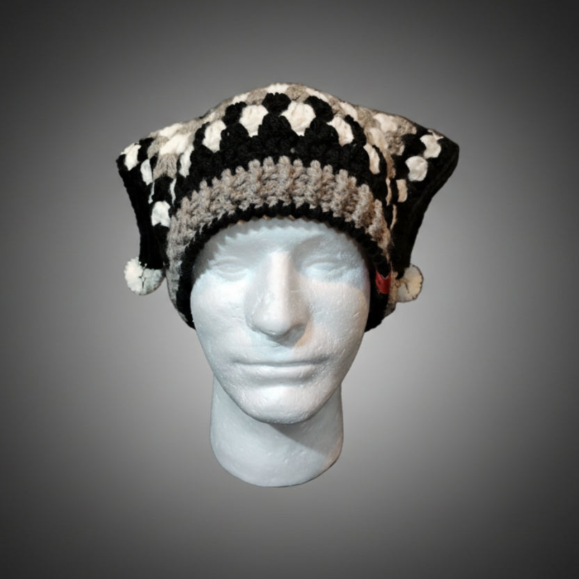 This jester beanie looks like it crawled out of a midnight carnival that only appears when the streetlights flicker. Its black‑white‑grey pattern isn’t playful so much as taunting....